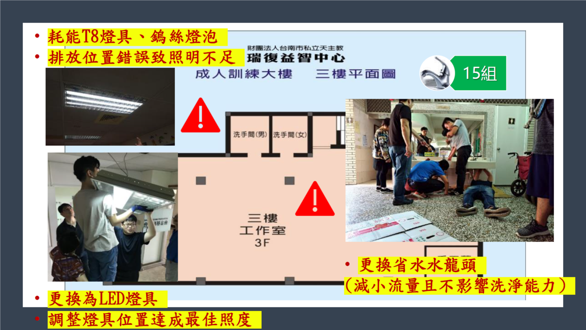 本計畫藉由6類課程培訓先鋒隊隊員,增強其節能知能,並實際運用於瑞復益智中心的節能設備改善與節能宣導活動。本次協助活動分為硬體設置及環境教育兩構面,在硬體設置方面協助該機構將現有T8燈具淘汰換為T5燈具和LED燈具,並計算空間最佳照度調整燈具位置或減少燈具盞數,共計將舊燈具汰換為86具T5燈管及32支LED燈管,每間教室可達25%至54%之省電成效,其次協助建置落葉堆肥場,約可處理該中心400~600 kg/月之落葉,達到垃圾減量及資源再利用之目標。在環境教育方面針對教職員與院生分別辦理節能教學課程,傳授節能觀念及日常應用,本次共計教學人數員工及院生298人,南臺科技大學師生15人,直接影響人數達313人。